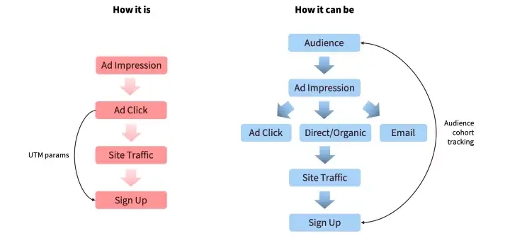 When you target your audience natively on ad platforms, the common way to measure results is via last-click conversion via UTM parameters. But very few B2B purchases are made from one click to an ad. When you build your audience with Primer, attribution becomes dead simple because you know up front who will be receiving your ads. This means you can measure the percent of leads who converted after being served an ad – whether they clicked on the ad or just viewed it – we call this audience cohort tracking. To calculate your conversion rate, simply look at the number of leads who were served your ad and the number of leads who signed up, regardless of the last source.