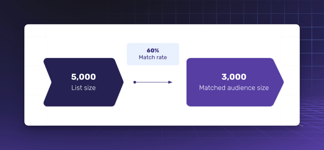 Match rate is merely the number of records found for a certain dataset in a particular ad platform’s database. For example, a 40% match rate on Facebook for a dataset of 100 profiles indicates that 40 of those profiles were found to exist on Facebook.