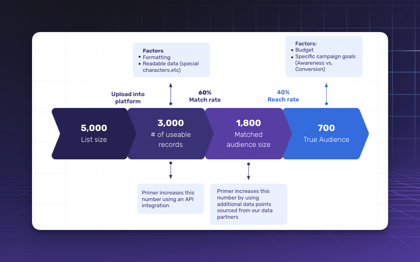 At Primer, we use match rates to gauge **initial** data quality. But we use **reach rate** to measure our true addressable audience. We've included these handy graphics below to help you visualize: